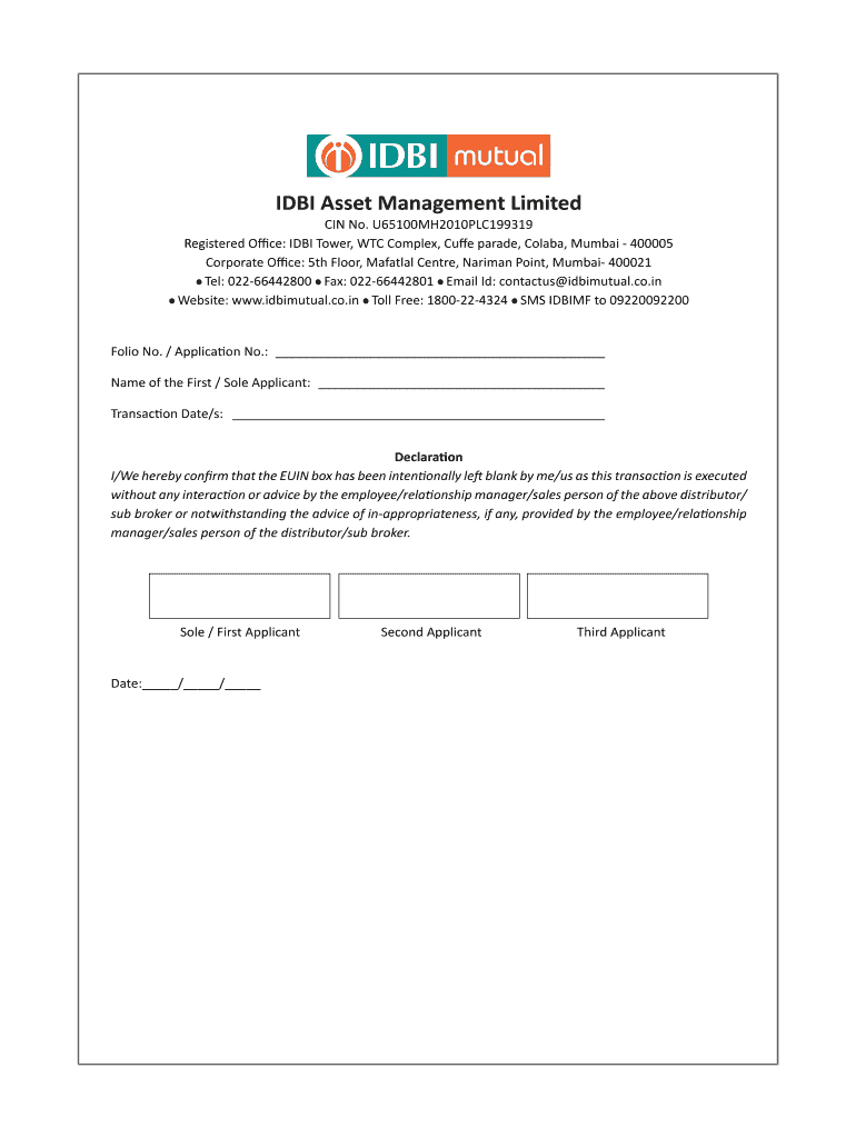 The IDBI Mutual Fund Application Form is an essential document for individuals looking to invest in mutual funds offered by IDBI Asset Management Limited. It serves as an application to initiate mutual fund investments, providing details like the applicant's folio number and transaction date. Completing this form accurately is crucial for a smooth investment process, emphasizing the importance of both the IDBI mutual fund application form and the IDBI investment form in financial decision-making.