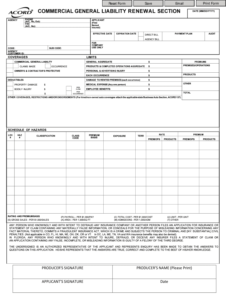 Each field on the Commercial General Liability Insurance Renewal Form requires specific information to ensure compliance and accuracy. Common fields include: