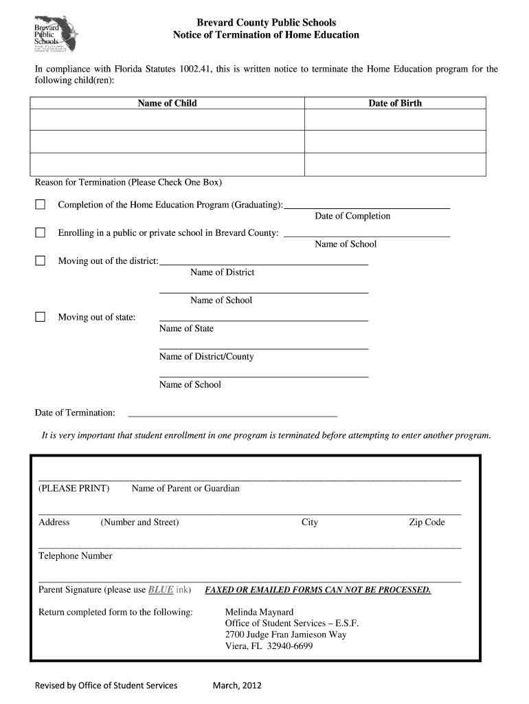 Brevard County Public Schools Notice of Termination of Home Education In compliance with Florida Statutes 1002.41, this is written notice to terminate the Home Education program for the following
