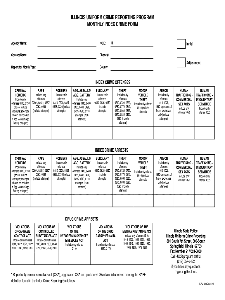 ILLINOIS UNIFORM CRIME REPORTING PROGRAM MONTHLY INDEX CRIME FORM Agency Name: CIC: Contact Name: Phone #: Report for Month/Year: IL County: Initial Adjustment INDEX CRIME OFFENSES CRIMINAL HOMICIDE