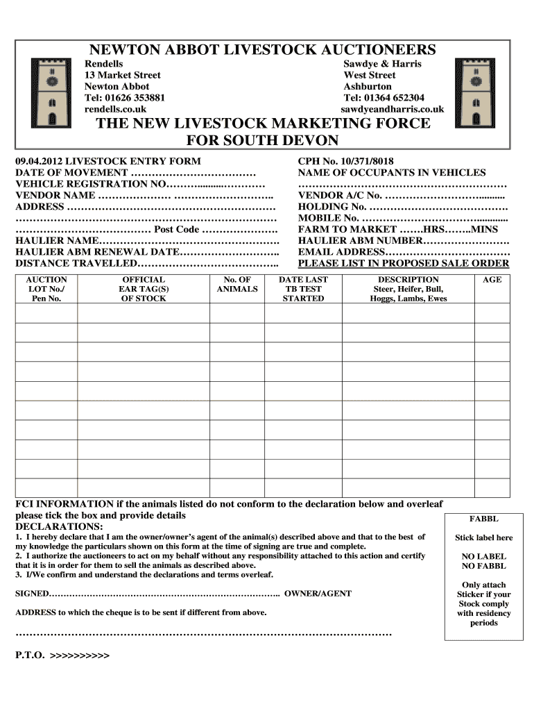 NEWTON ABBOT LIVESTOCK AUCTIONEERS Rend ells 13 Market Street Newton Abbot Tel: 01626 353881 rend ells.co.UK Saw dye & Harris West Street Ashburn Tel: 01364 652304 sawdyeandharris.co.UK THE NEW LIVESTOCK