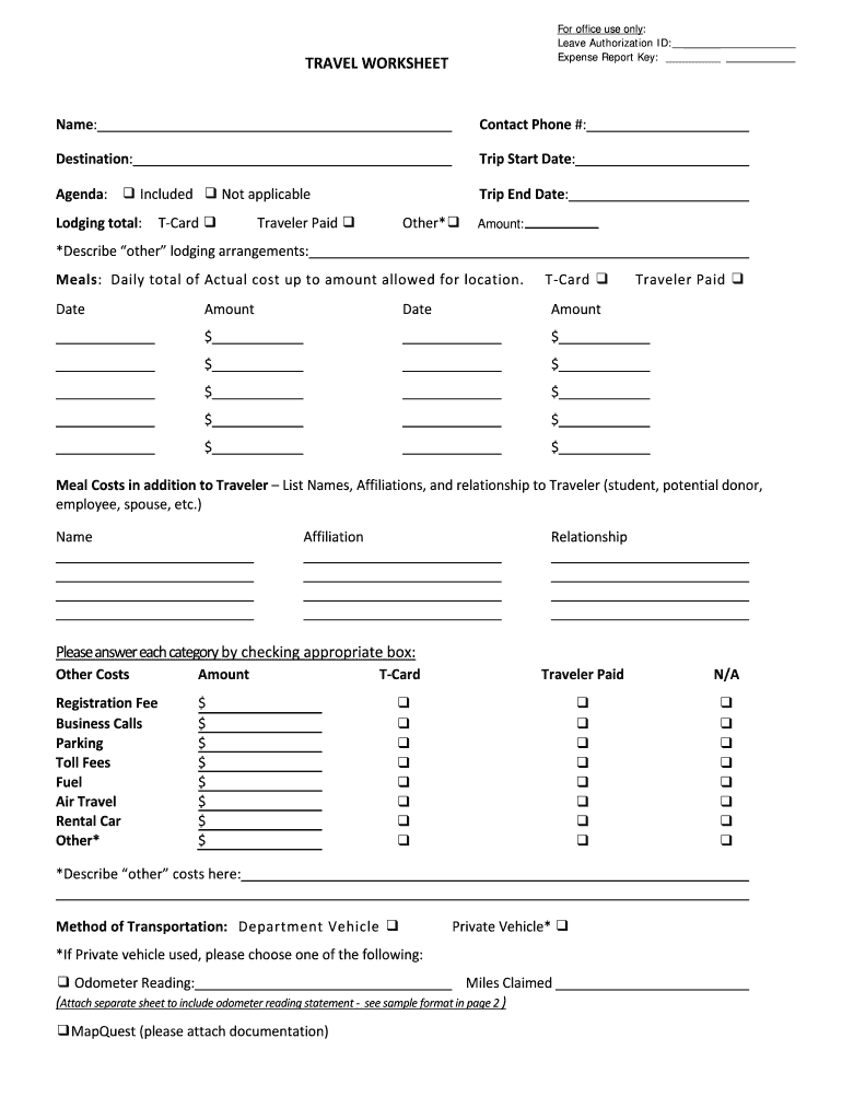 For office use only: Leave Authorization ID: Expense Report Key: TRAVEL WORKSHEET Name: Contact Phone #: Destination: Trip Start Date: Agenda: Included Not applicable Trip End Date: Lodging total: