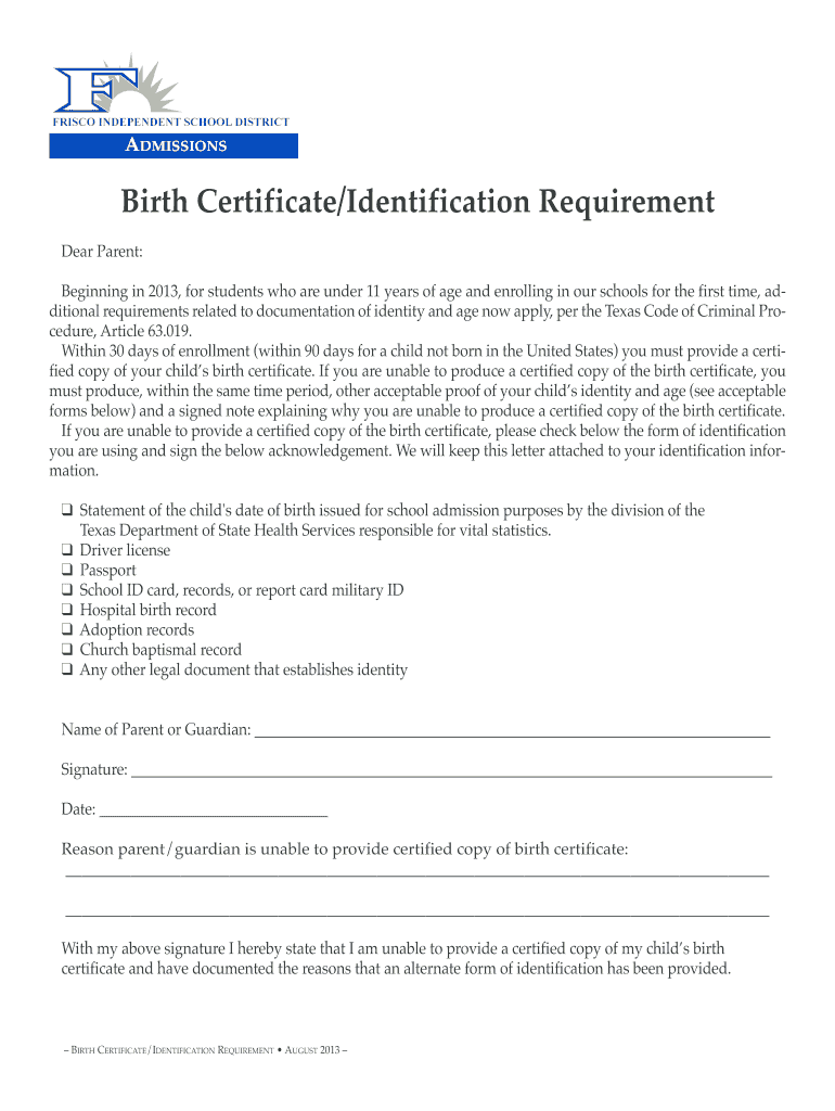 Providing proof of identity and age through the Texas Birth Certificate/Identification Requirement is crucial for several reasons. First and foremost, it ensures that schools can accurately assess a child's eligibility for enrollment based on age. Failure to present the required documentation can lead to legal complications and hinder a child's opportunity for education in the state. Schools rely on this information to maintain accurate records and fulfill legal obligations.