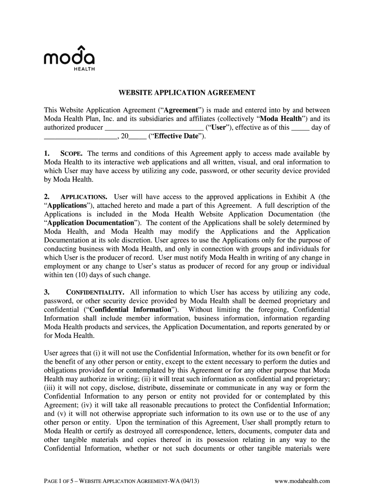 The Website Application Agreement is a Service Agreement used by Moda Health and its authorized producers to outline terms for accessing web applications.