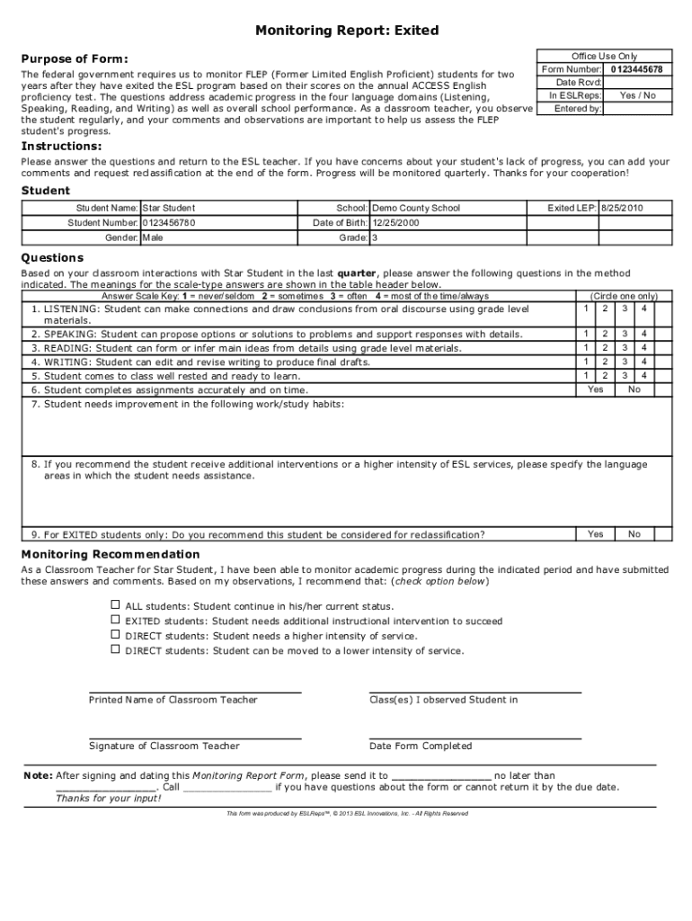 Get the free Monitoring Report Form for Exited FLEP Students