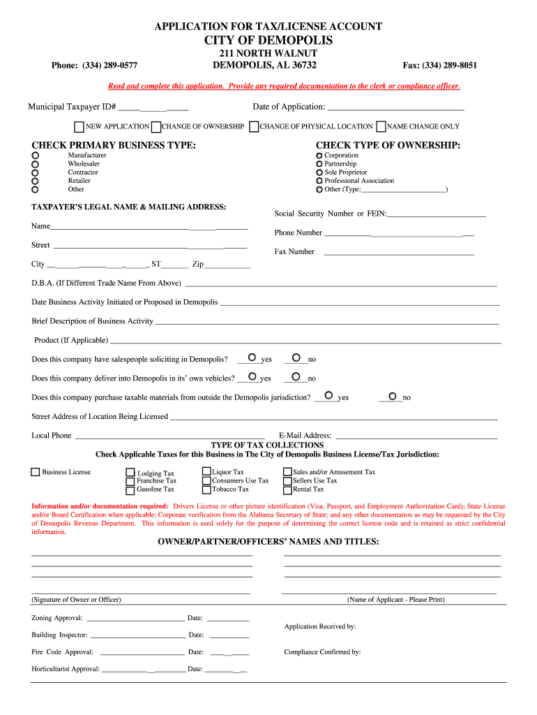 APPLICATION FOR TAX/LICENSE ACCOUNTING OF DEMOLISH Phone: (334) 2890577211 NORTH WALNUT DEMOLISH, AL 36732Fax: (334) 2898051Read and complete this application. Provide any required documentation to