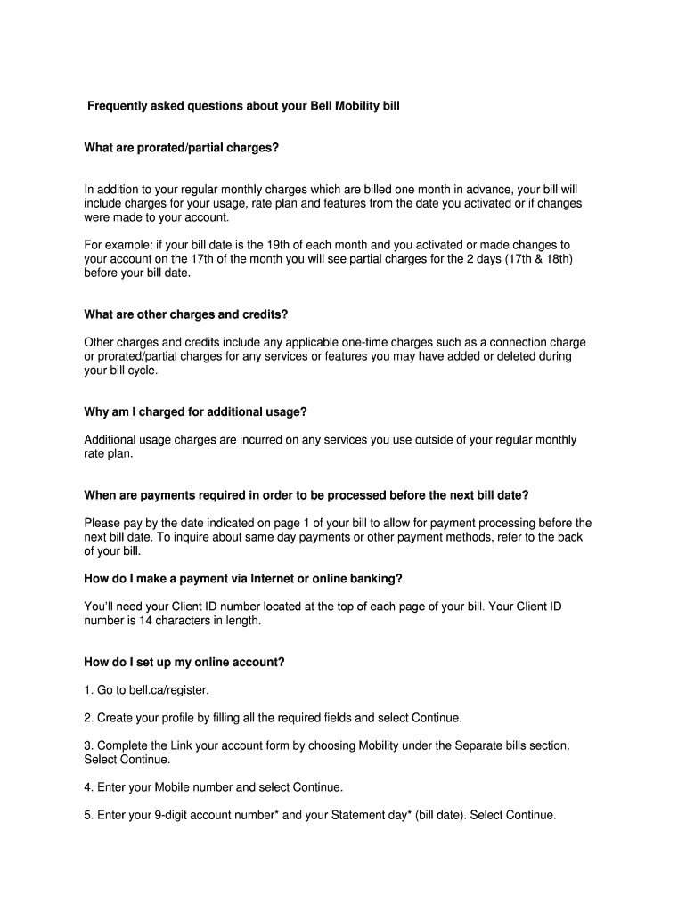 Frequently asked questions about your Bell Mobility billet are prorated/partial charges? In addition to your regular monthly charges which are billed one month in advance, your bill will include charges