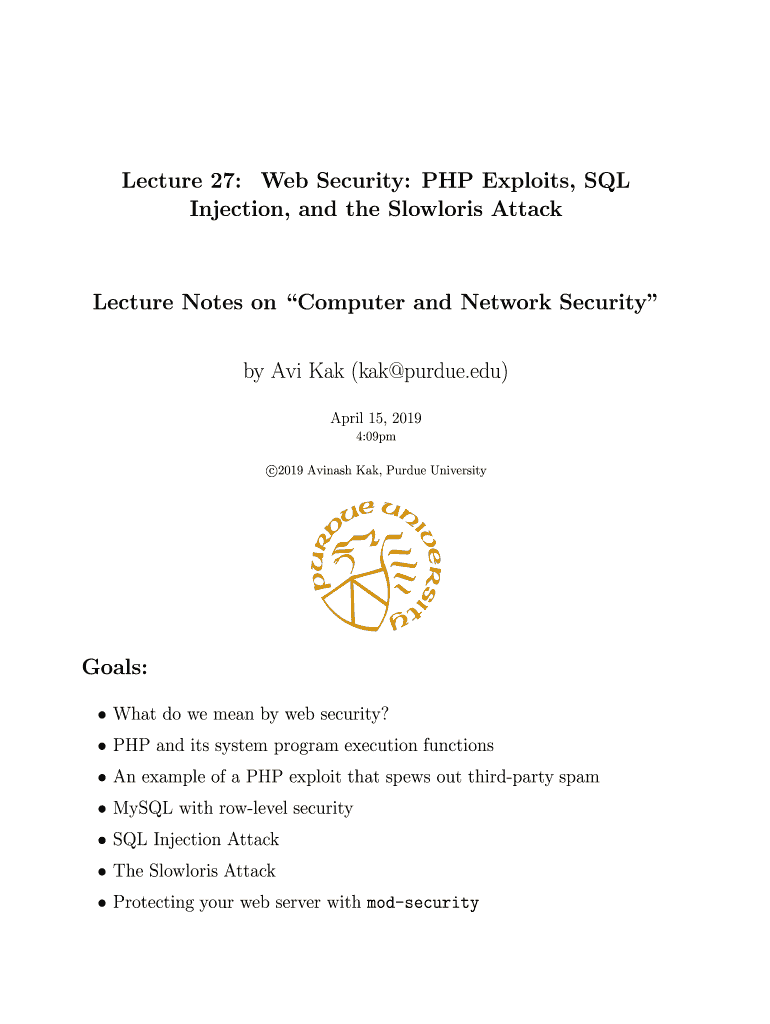 Lecture 27: Web Security: PHP Exploits, SQL Injection, and the Slow loris AttackLecture Notes on Computer and Network Security by AVI Key (key Purdue.edu) April 15, 2019 4:09pm c2019 Avinash Key,
