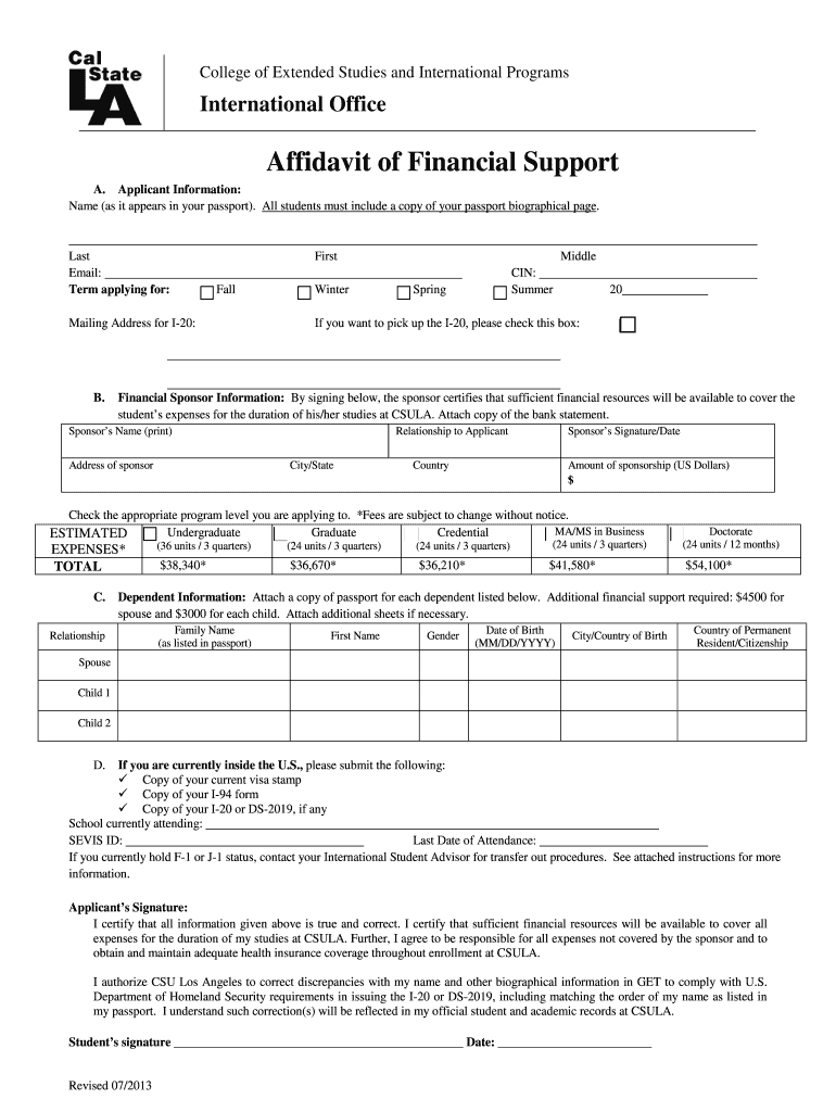 The Affidavit of Financial Support is a document used by international students to demonstrate proof of financial resources for their studies at California State University, Los Angeles (CSULA).