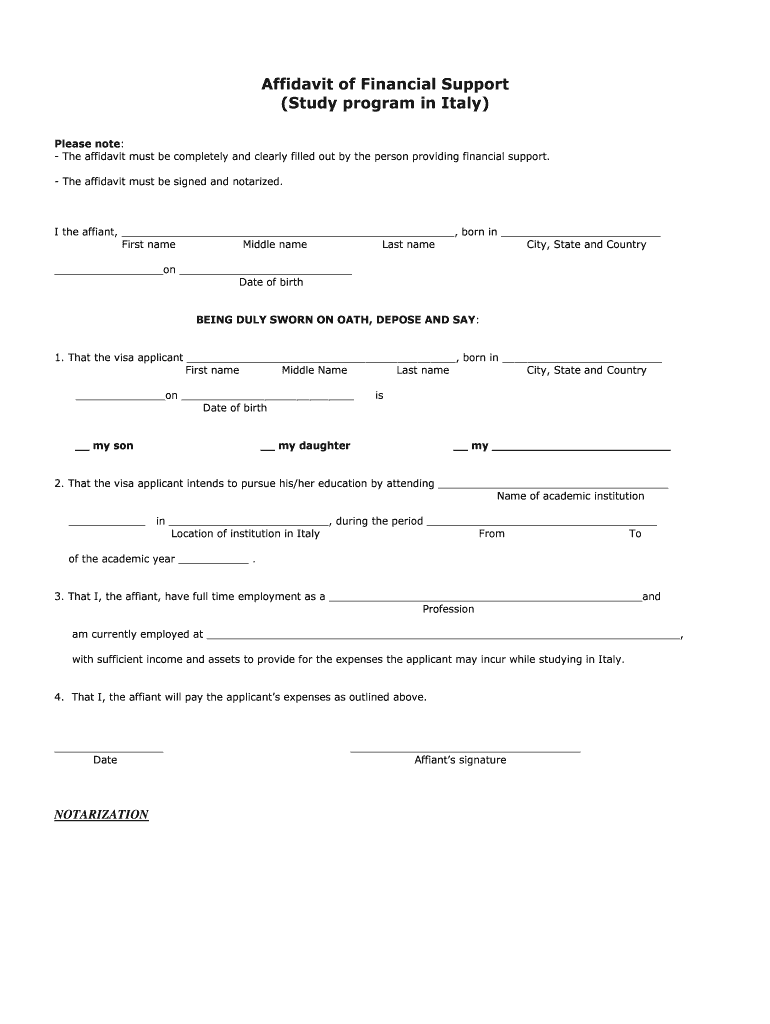 The Affidavit of Financial Support is a legal document used by individuals to demonstrate financial backing for a visa applicant planning to study in Italy.