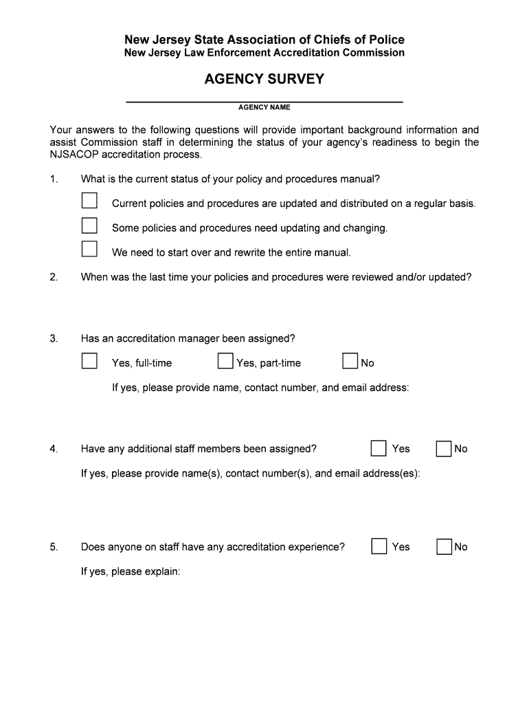 New Jersey State Association of Chiefs of Police New Jersey Law Enforcement Accreditation Commission AGENCY SURVEY AGENCY NAME Your answers to the following questions will provide important background