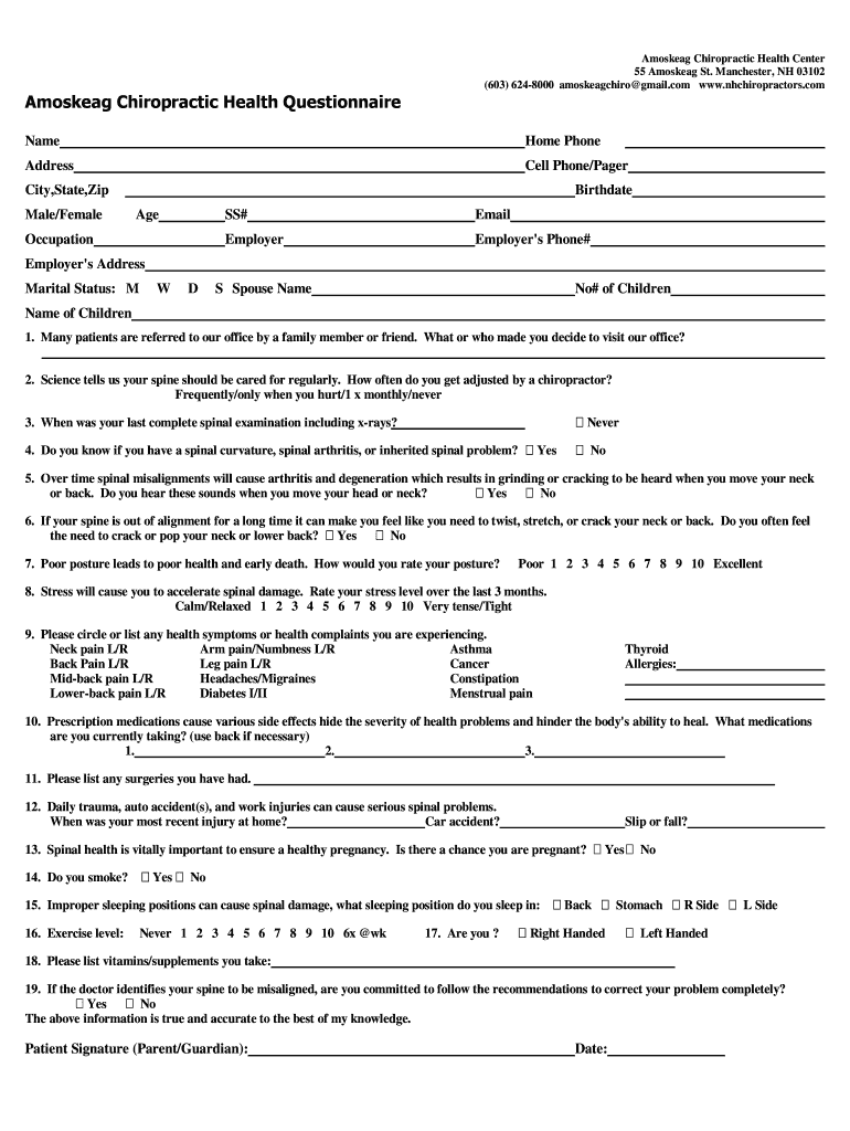 Get the free Amoskeag Chiropractic Health Questionnaire