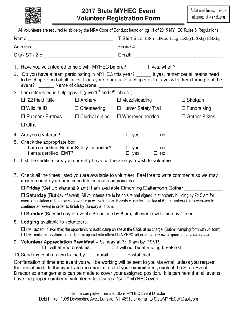 2017 State MY HEC Event Volunteer Registration FormAdditional forms may be obtained at MY HEC.oral volunteers are required to abide by the NRA Code of Conduct found on pg 11 of 2015 MY HEC Rules &