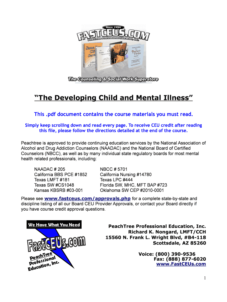The Developing Child and Mental Illness This .pdf document contains the course materials you must read. Simply keep scrolling down and read every page. To receive CEU credit after reading this file,