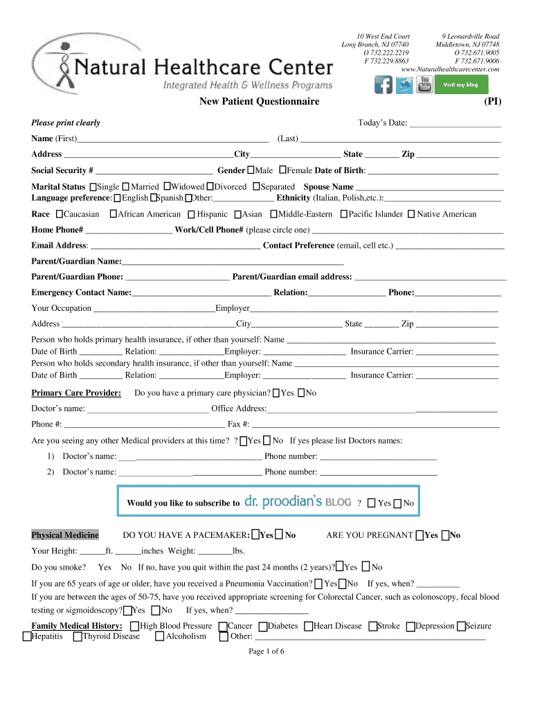 Get the free New Patient Questionnaire (PI) - Natural Healthcare Center