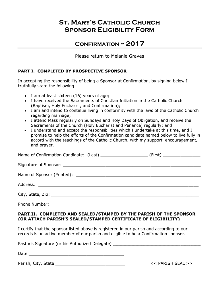 St. Mary's Catholic Church Sponsor Eligibility Form Confirmation 2017 Please return to Melanie Graves PART I. COMPLETED BY PROSPECTIVE SPONSOR In accepting the responsibility of being a Sponsor at