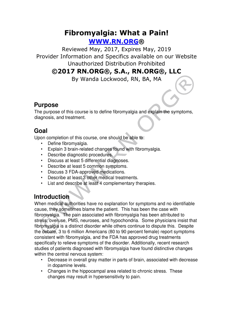 Fibromyalgia: What a Pain! WWW.RN.ORG Reviewed May 2017, Expires May 2019 Provider Information and Specifics available on our Website Unauthorized Distribution Prohibited2017 RN.ORG, S.A., RN.ORG,