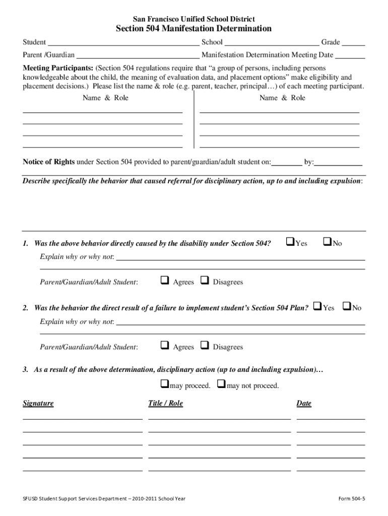 By effectively utilizing the section 504 manifestation form, educators and administrators can ensure that students receive the appropriate support and interventions necessary for their success. The California 504 form requires listing all participants and documenting behavioral concerns, making it essential for proper compliance with educational regulations.
