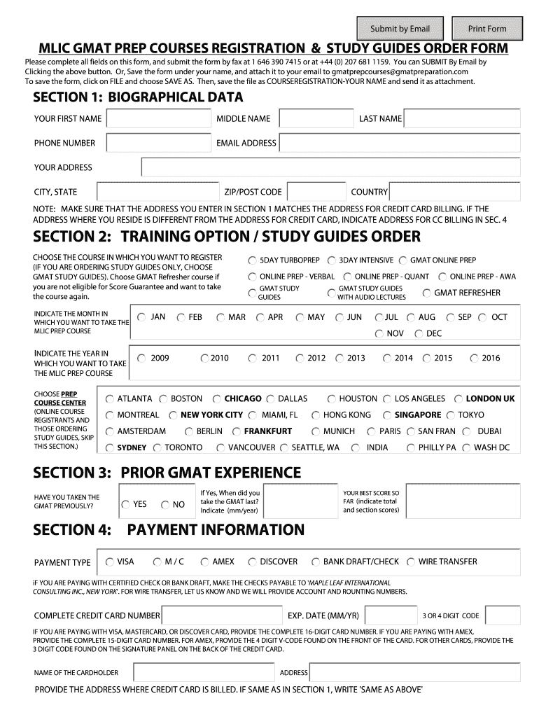 The GMAT Prep Course Registration Form consists of several key fields, each requiring specific information: