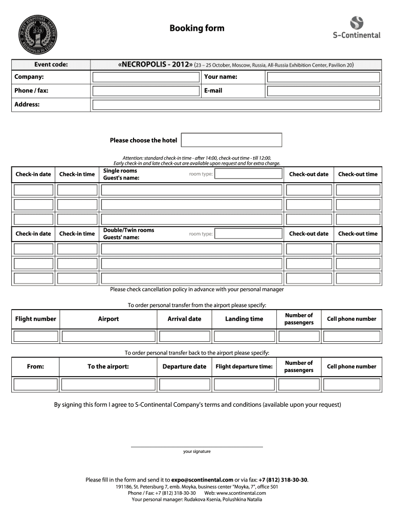 Booking form NECROPOLIS 2012 (23 25 October, Moscow, Russia, All-Russia Exhibition Center, Pavilion 20) Event code: Company: Your name: Phone / fax: E-mail Address: Please choose the hotel Attention: