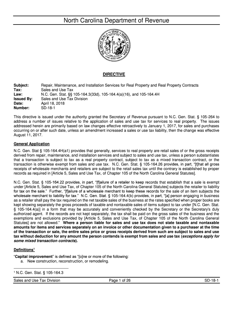 North Carolina Department of RevenueDIRECTIVE Subject: Tax: Law: Issued By: Date: Number:Repair, Maintenance, and Installation Services for Real Property and Real Property Contracts Sales and Use