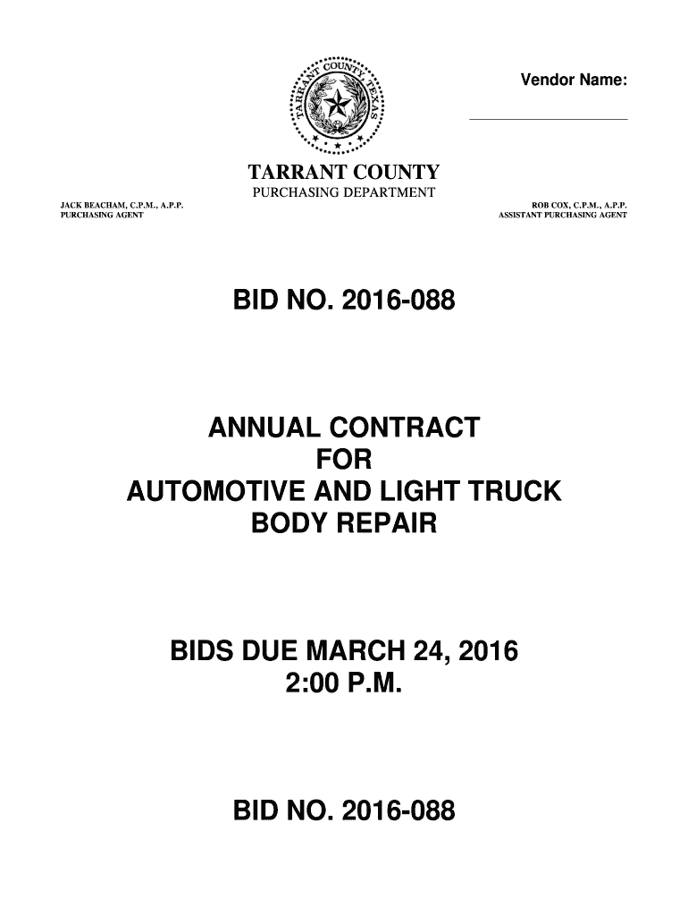 Vendor Name: TARRANT COUNTY PURCHASING DEPARTMENT JACK BEA CHAM, C.P.M., A.P.P. PURCHASING AGENT COX, C.P.M., A.P.P. ASSISTANT PURCHASING AGENT BID NO. 2016088ANNUAL CONTRACT FOR AUTOMOTIVE AND LIGHT