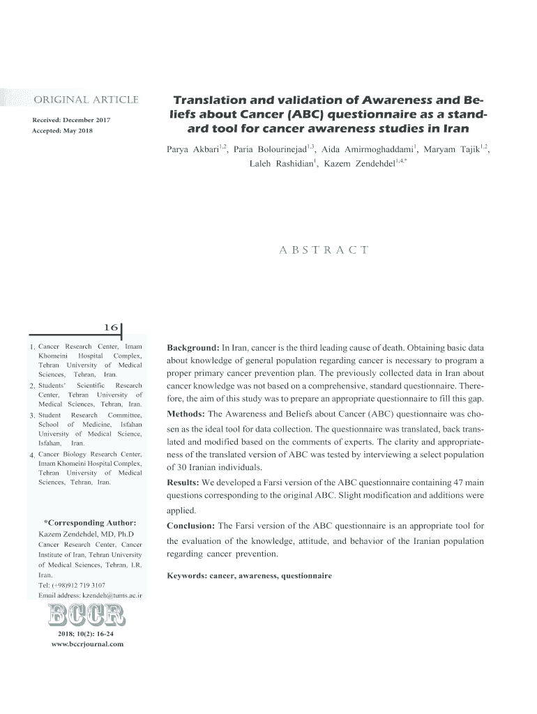 Accepted: May 2018Translation and validation of Awareness and Beliefs about Cancer (ABC) questionnaire as a standard tool for cancer awareness studies in Iran