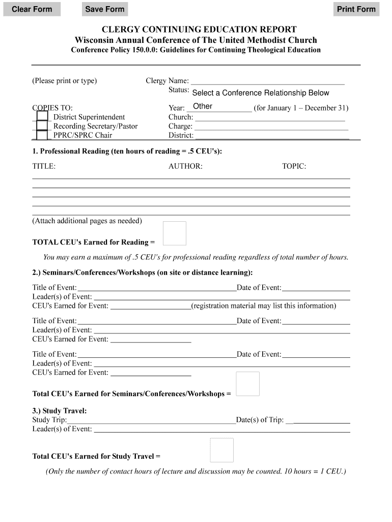 The Clergy Continuing Education Report is a document used by clergy members in Wisconsin to report their continuing theological education activities for the year.
