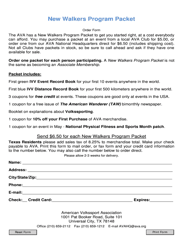 Any individual interested in participating in the American Volkssport Association's New Walkers Program can use this form to order their packet.