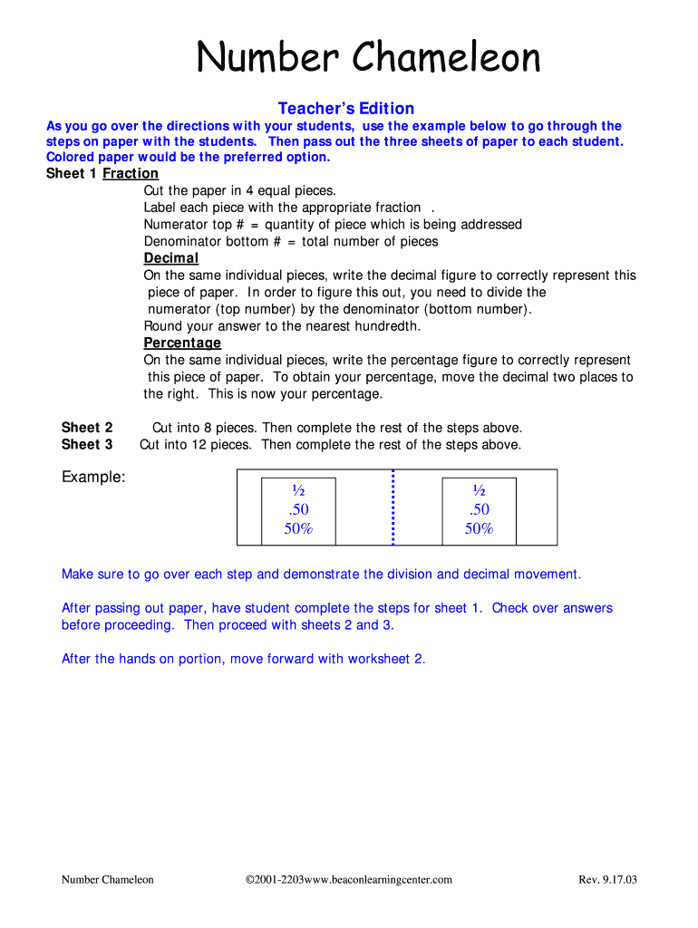 The Number Chameleon Teacher's Edition is a specialized math worksheet template designed to assist educators in teaching fundamental concepts of fractions, decimals, and percentages. This educational math template includes comprehensive fillable fields that guide both teachers and students in completing exercises effectively.