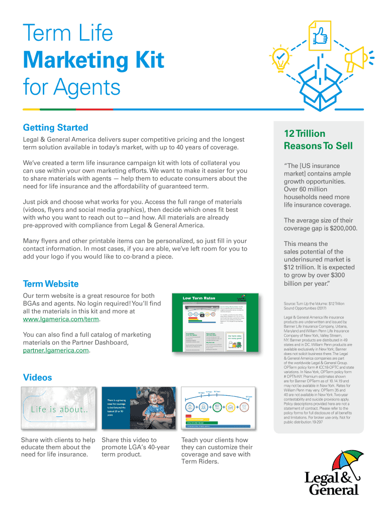Term Life Marketing Kit for Agents Getting Started Legal & General America delivers super competitive pricing and the longest term solution available in today's market, with up to 40 years of coverage.