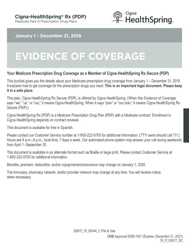 January1 December31, 2019EVIDENCE OF COVERAGE Your Medicare Prescription Drug Coverage as a Member of CignaHealthSpring Rx Secure (PDP) This booklet gives you the details about your Medicare prescription