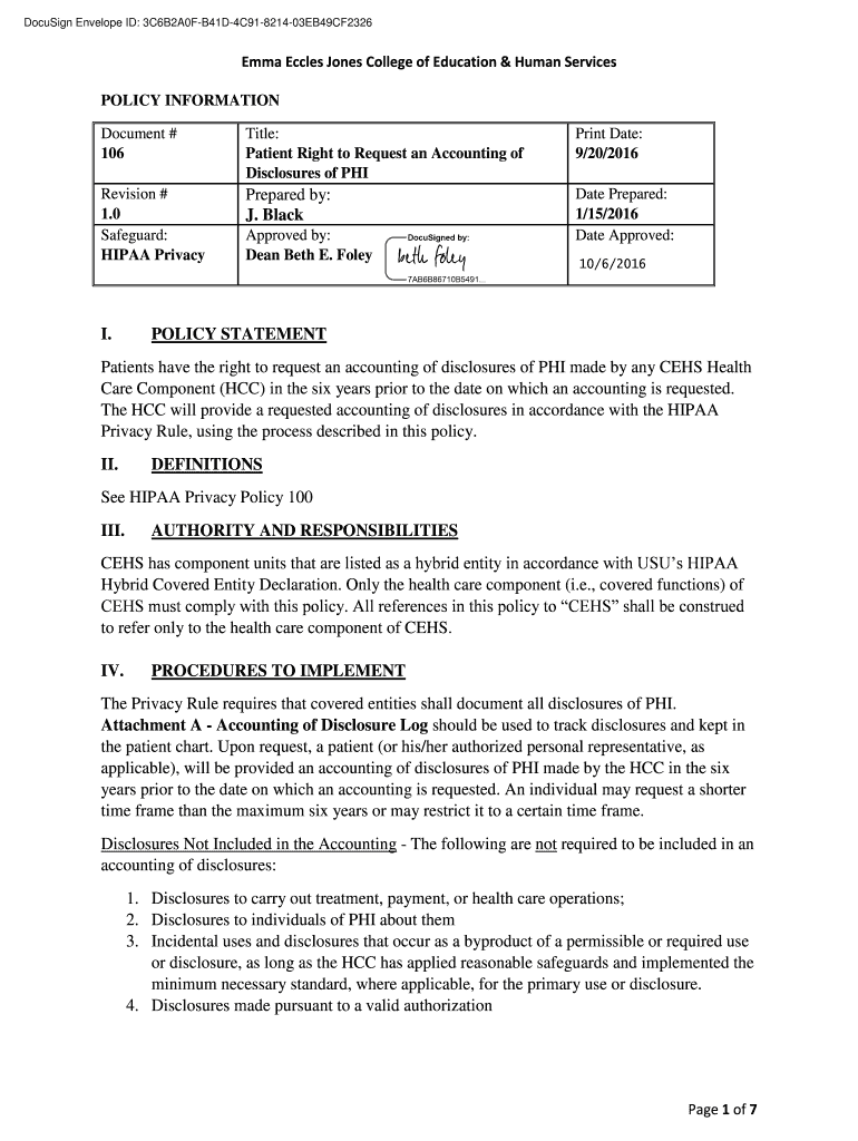 DocuSign Envelope ID: 3C6B2A0FB41D4C91821403EB49CF2326Emma Eccl BS Jones College of Education & Human Services POLICY INFORMATION Document # 106Title: Patient Right to Request an Accounting of Disclosures
