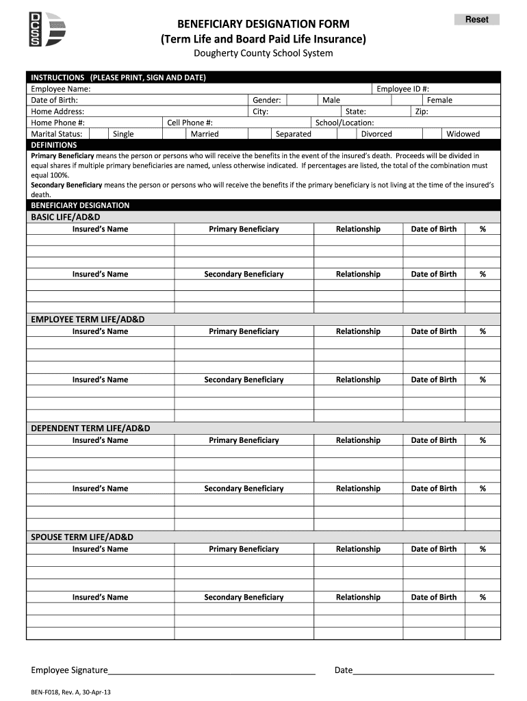 Reset BENEFICIARY DESIGNATION FORM (Term Life and Board Paid Life Insurance) Dougherty County School System INSTRUCTIONS (PLEASE PRINT, SIGN AND DATE) Employee Name: Date of Birth: Home Address: Home