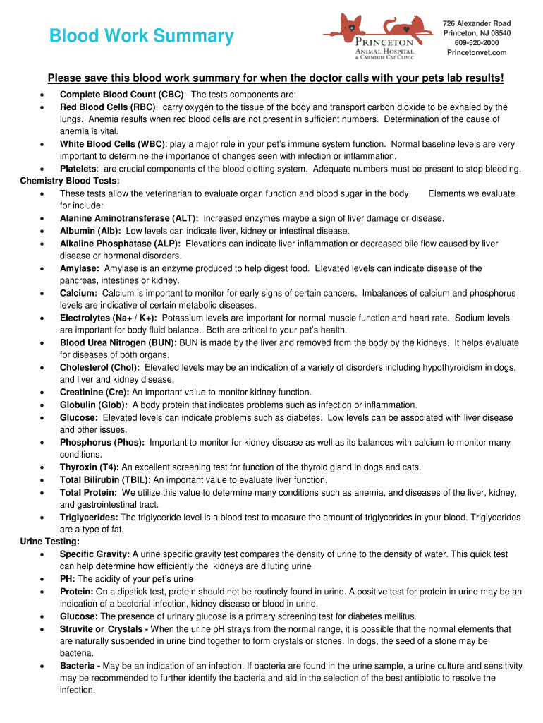 Blood Work Summary726 Alexander Road Princeton, NJ 08540 6095202000 Princeton vet. Complete save this blood work summary for when the doctor calls with your pets lab results! Complete Blood Count