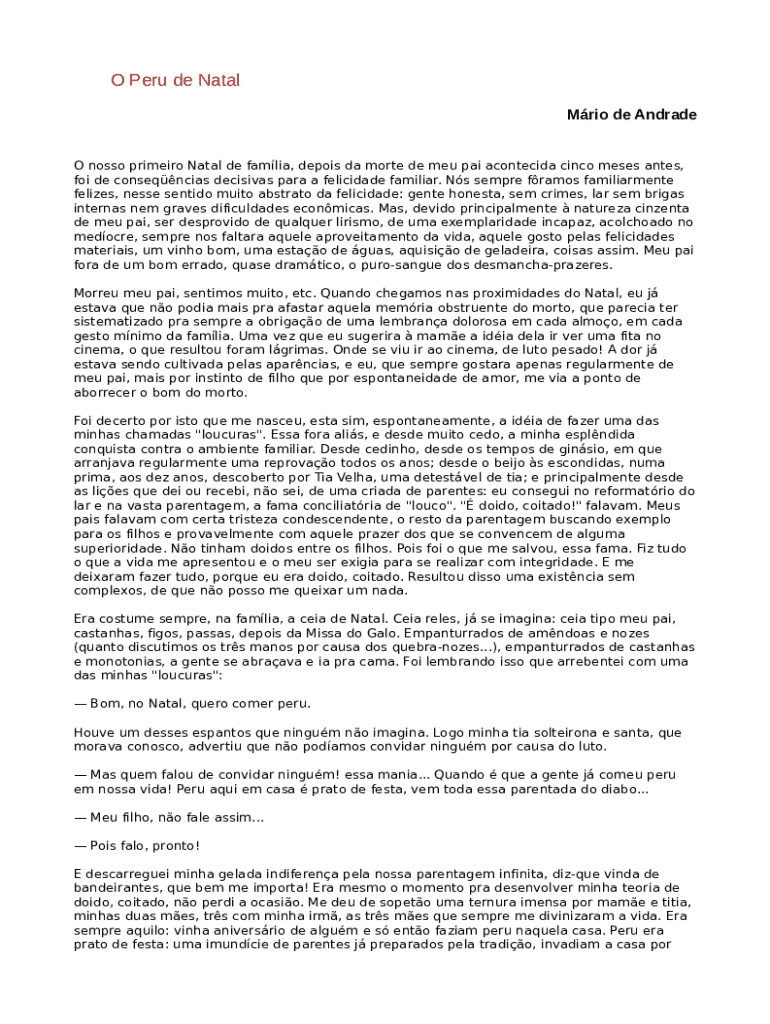 O Peru de Natal Mrio de Andrade O nosso primeiro Natal de famlia, depois da morte de meu pai acontecida cinco meses antes, foi de conseqncias decisivas para a felicidade familiar. Ns sempre framos
