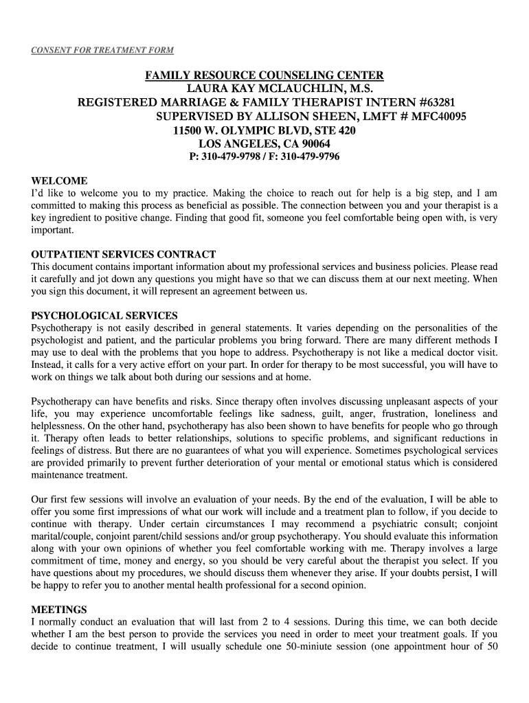 CONSENT FOR TREATMENT FORMALLY RESOURCE COUNSELING CENTERLAURA KAY McLaughlin, M.S. REGISTERED MARRIAGE & FAMILY THERAPIST INTERN #63281 SUPERVISED BY ALLISON SHEEN, LEFT # MFC40095 11500 W. OLYMPIC