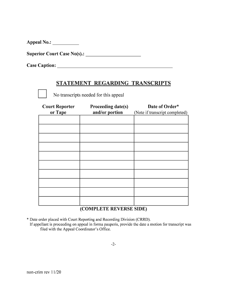 Appeal No.: Superior Court Case No(s).: Case Caption: STATEMENT REGARDING TRANSCRIPTS No transcripts needed for this appeal Court Reporter or Tape Proceeding date(s) and/or portion Date of Order*
