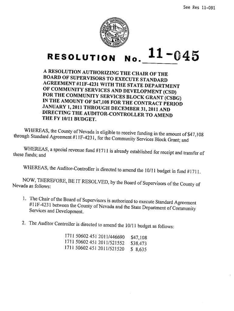 See Res 11-091 (0 RESOLUTION No. 11 0, 45 A RESOLUTION AUTHORIZING THE CHAIR OF THE BOARD OF SUPERVISORS TO EXECUTE STANDARD AGREEMENT 41 IF-4231 WITH THE STATE DEPARTMENT OF COMMUNITY SERVICES AND