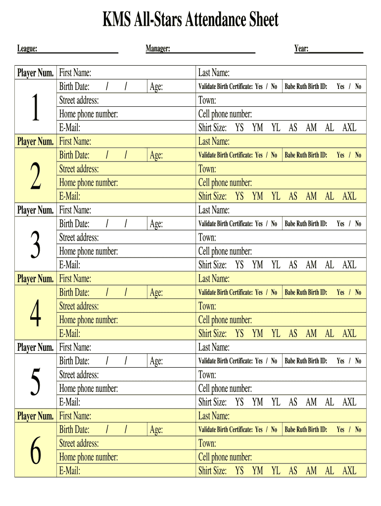 KMS All-Stars Attendance Sheet League: Player Sum. First Name: Birth Date: / Street address: Home. Phone number: E-Mail: Player Sum. First Name: Birth Date: / Street address: Home. Phone number: E-Mail: