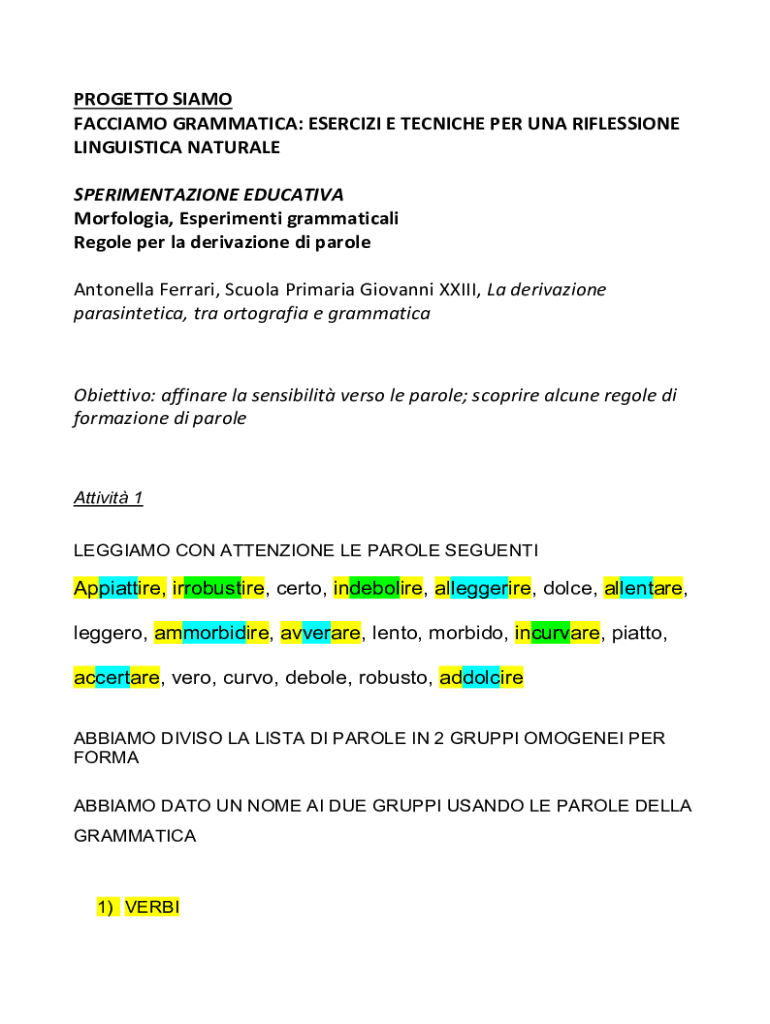 PROJECT SIAMOFACCIAMO GRAMMATICAL: EXERCISE E TECHNICAL PER RNA RIFLESSIONELINGUISTICA NATURALESPERIMENTAZIONE EDUCATIVAMorfologia, Experiment grammaticaliRegole per la derivation DI paroleAntonella Ferrari, Sculley Prim