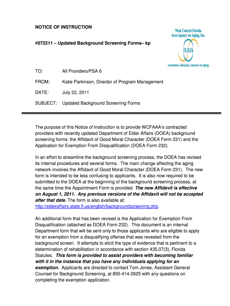 NOTICE OF INSTRUCTION #072211 Updated Background Screening Forms KP TO: All Providers/PSA 6 FROM: Katie Parkinson, Director of Program Management DATE: July 22, 2011, SUBJECT: Updated Background Screening