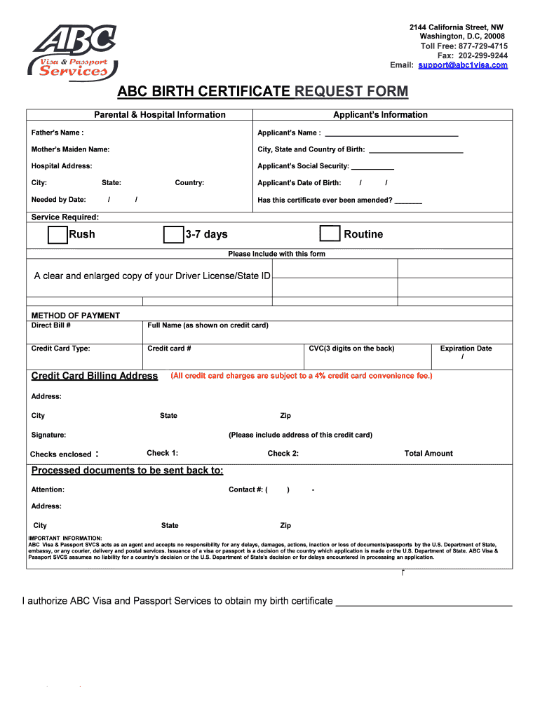 Get the free Birth Certificate Request Form - ABC Visa & Passport Services