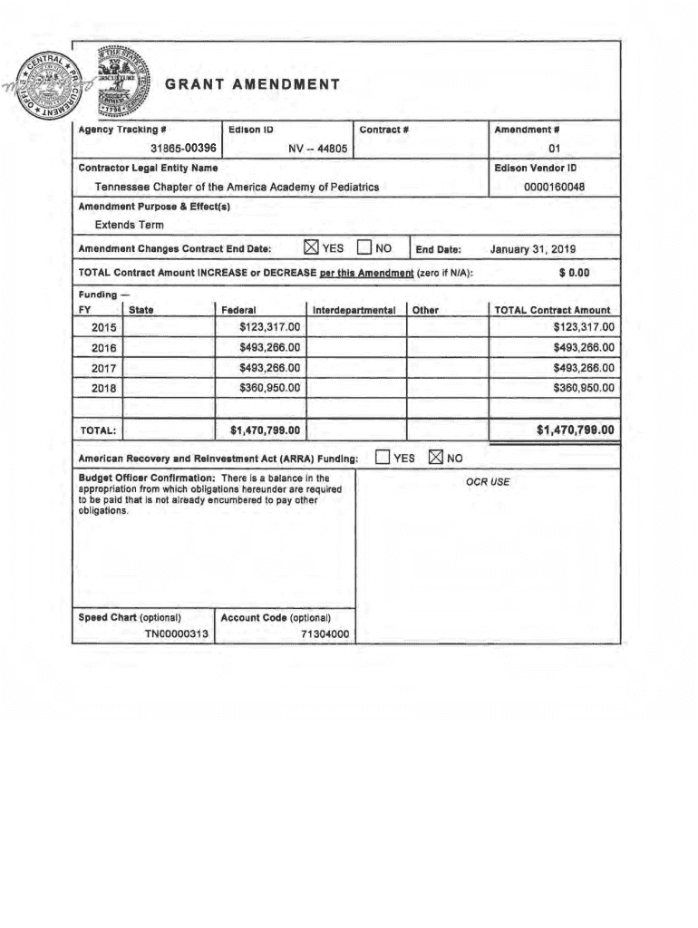 GRANT AMENDMENT Agency Tracking×Edison ID00396 3186500096Contract×Amendment×NV 4480501Contractor Legal Entity Name Edison Vendor ID Tennessee Chapter of the America Academy of Pediatrics0000160048Amendment