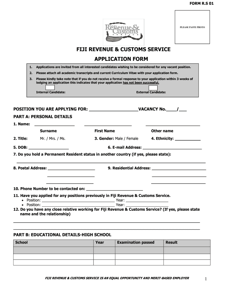 FORM R. S 01PLEASE PASTE PHOTOING REVENUE & CUSTOMS SERVICE APPLICATION FORM 1. Applications are invited from all interested candidates wishing to be considered for any vacant position.2. Please attach