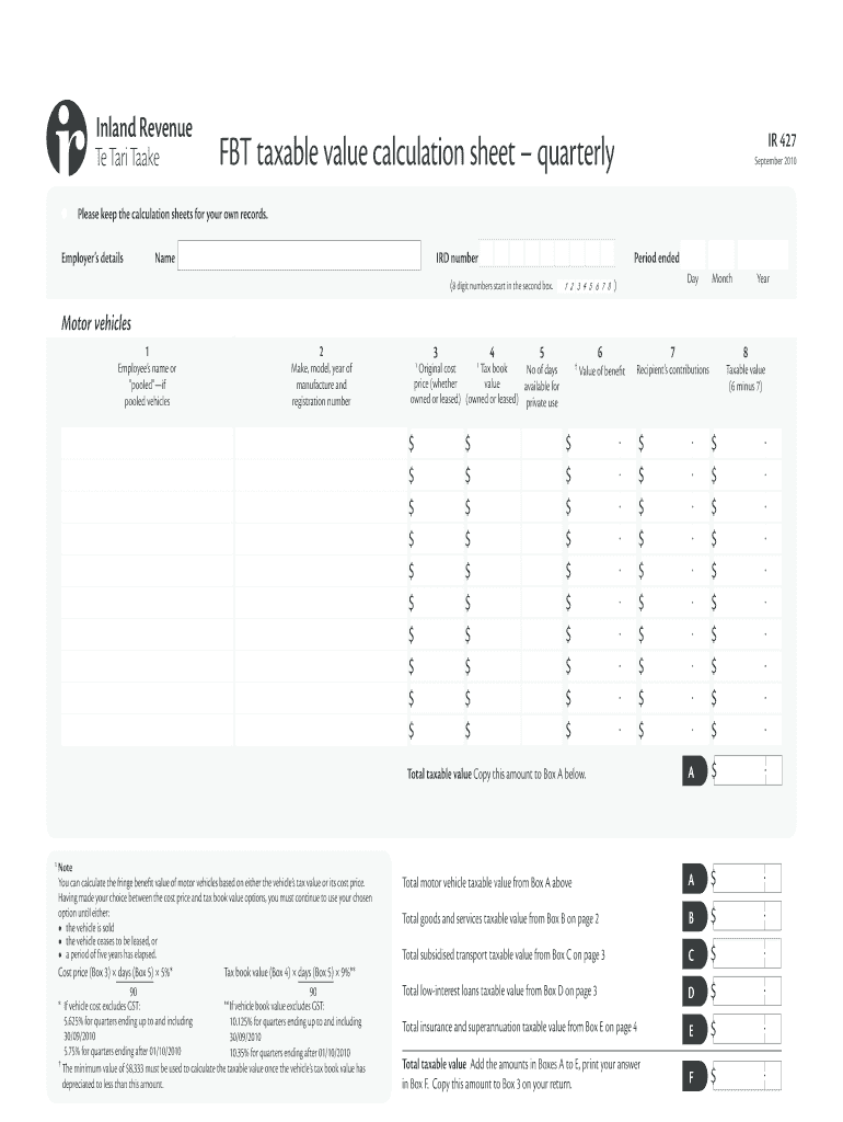 FBI taxable value calculation sheet quarterly IR 427 September 2010 Please keep the calculation sheets for your own records. Name Employers details IRD number Period ended (8-digit numbers start in