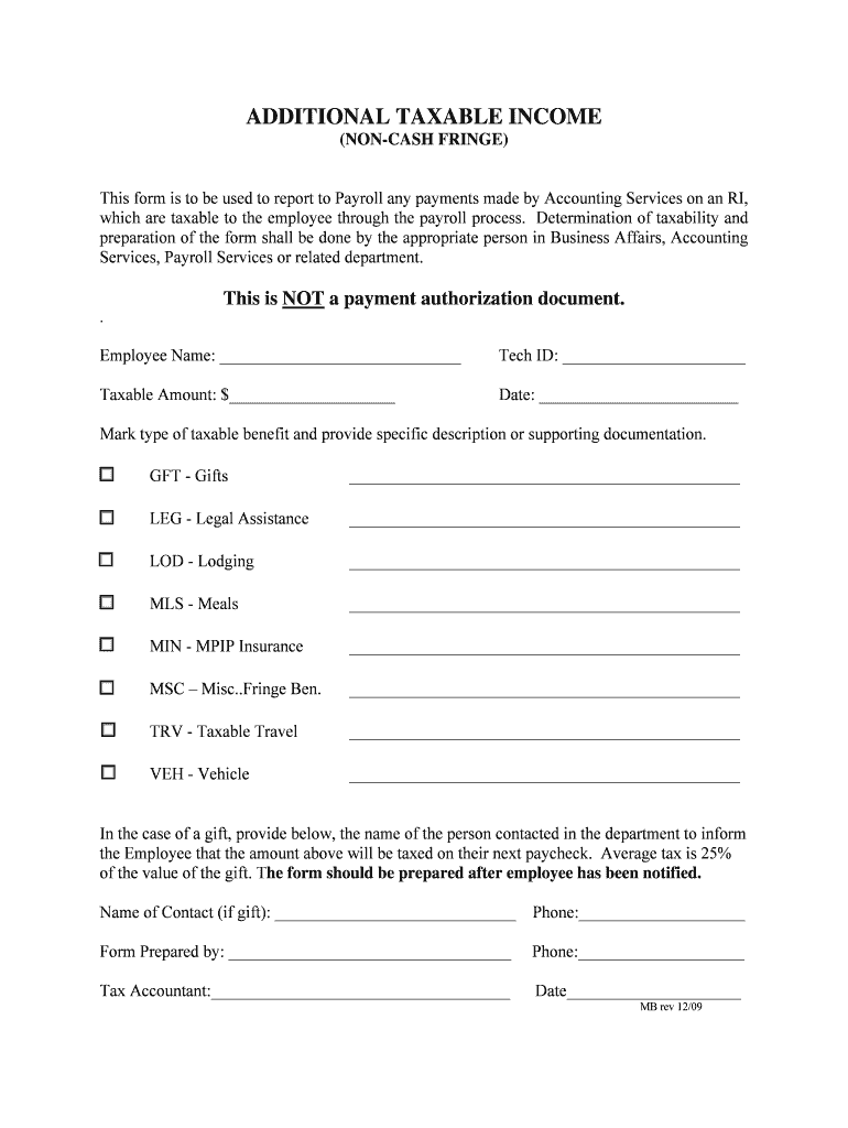 ADDITIONAL TAXABLE INCOME (NON-CASH FRINGE) This form is to be used to report to Payroll any payments made by Accounting Services on an RI, which are taxable to the employee through the payroll process.