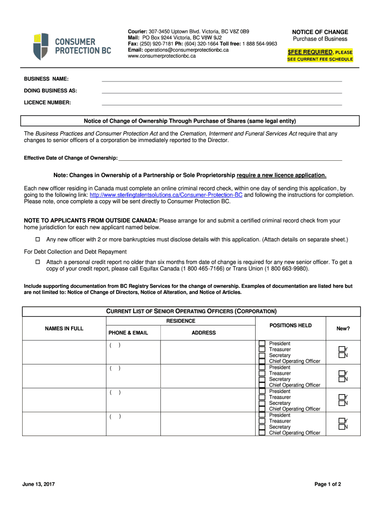 Get the free Notice of Change Purchase of Business