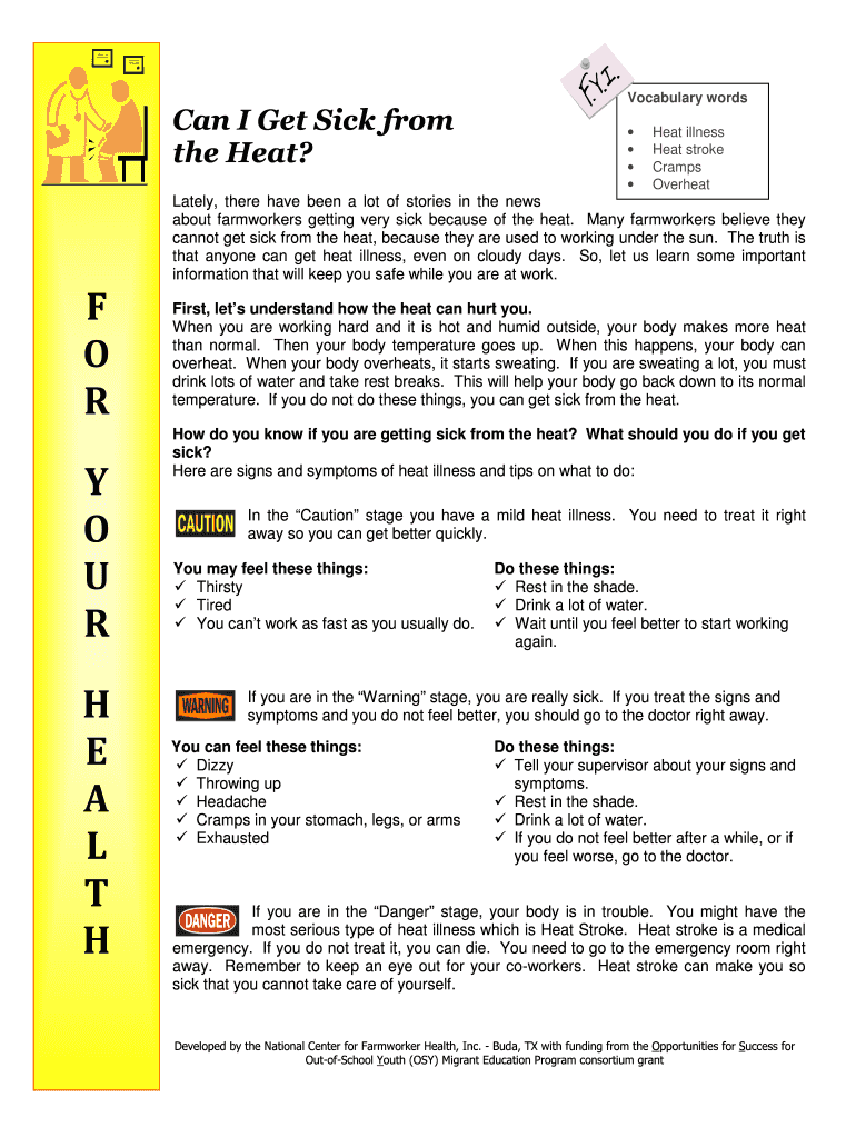 The Heat Illness Prevention Guide is a vital resource aimed at enhancing farmworker health by providing essential information on heat-related illnesses. Developed by the National Center for Farmworker Health, this guide educates farmworkers on the importance of recognizing and addressing heat illness symptoms. By emphasizing heat illness prevention, it serves as a comprehensive farmworker health guide to ensure safety in agricultural environments.