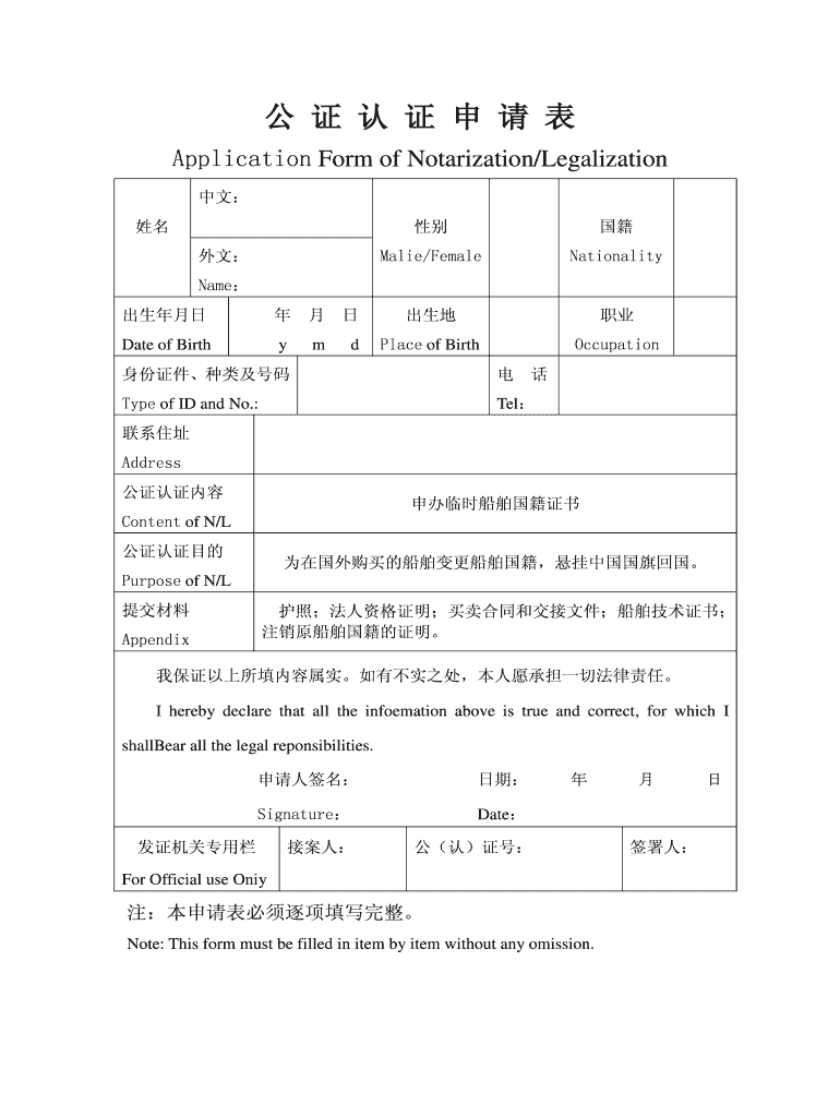 The Notarization/Legalization Application Form is a legal document used by individuals to apply for the notarization or legalization of documents for changing the nationality of a ship to Chinese nationality.